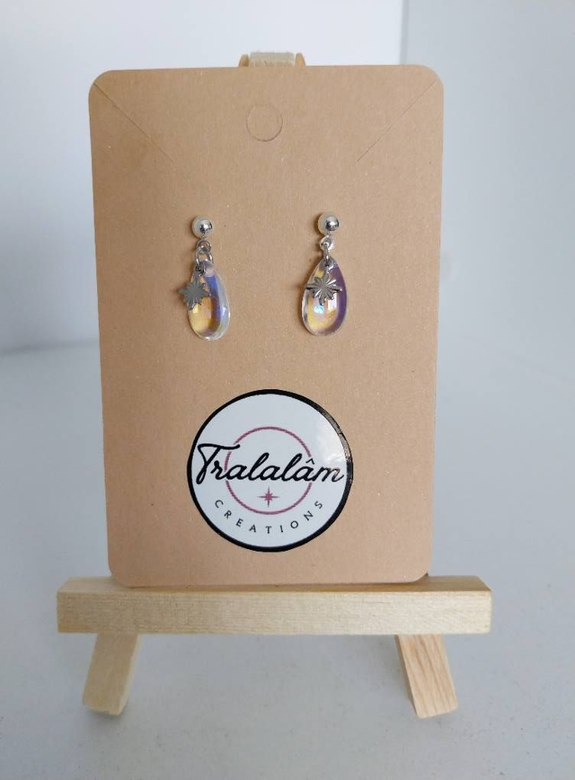 Tout en finesse (2 cm), ces boucles captivent avec une goutte transparente aux reflets irisés, sublimée d’un motif argenté étoilé. Un éclat magique et changeant, idéal pour briller en toutes occasions.