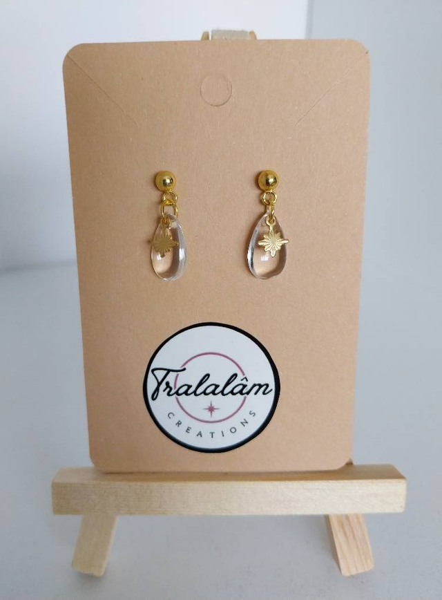 Épurées et lumineuses, ces boucles (environ 2 cm) marient la clarté d’une goutte cristal pur à un motif doré étoilé. Un bijou minimaliste et raffiné qui s’accorde avec tout.