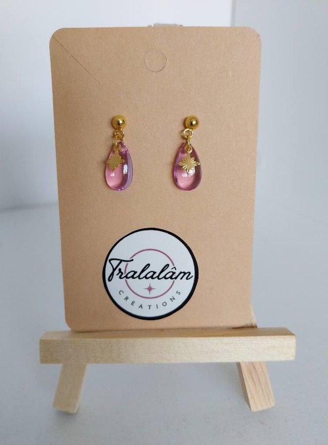 Tout en légèreté (2 cm), ces boucles associent la transparence délicate d’une goutte rose cristal à l’éclat d’un motif doré étoilé. Une touche subtile et féminine qui capte joliment la lumière.