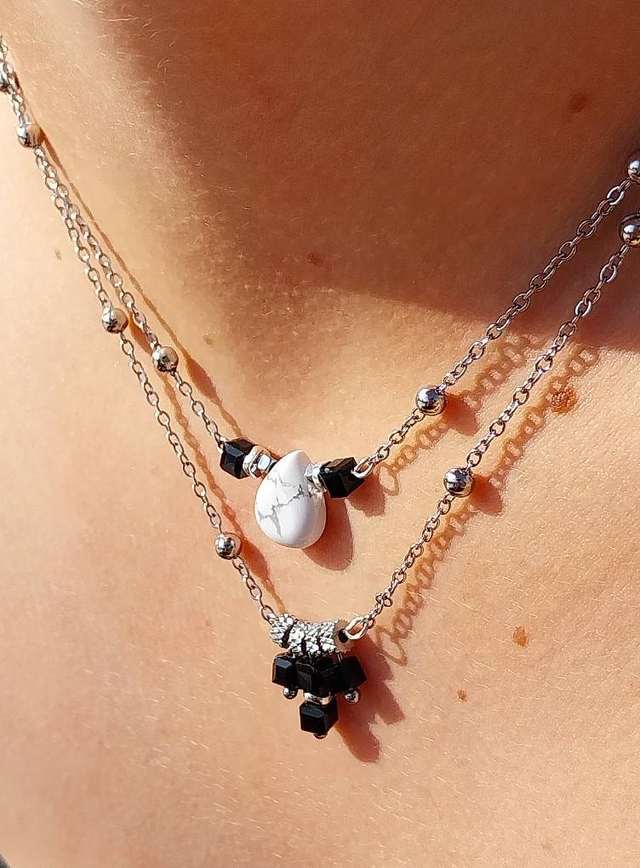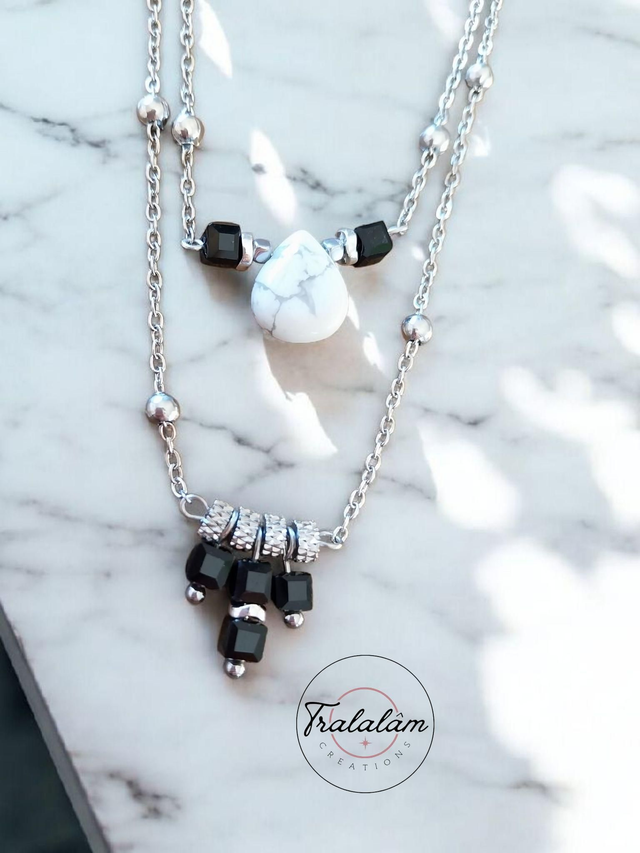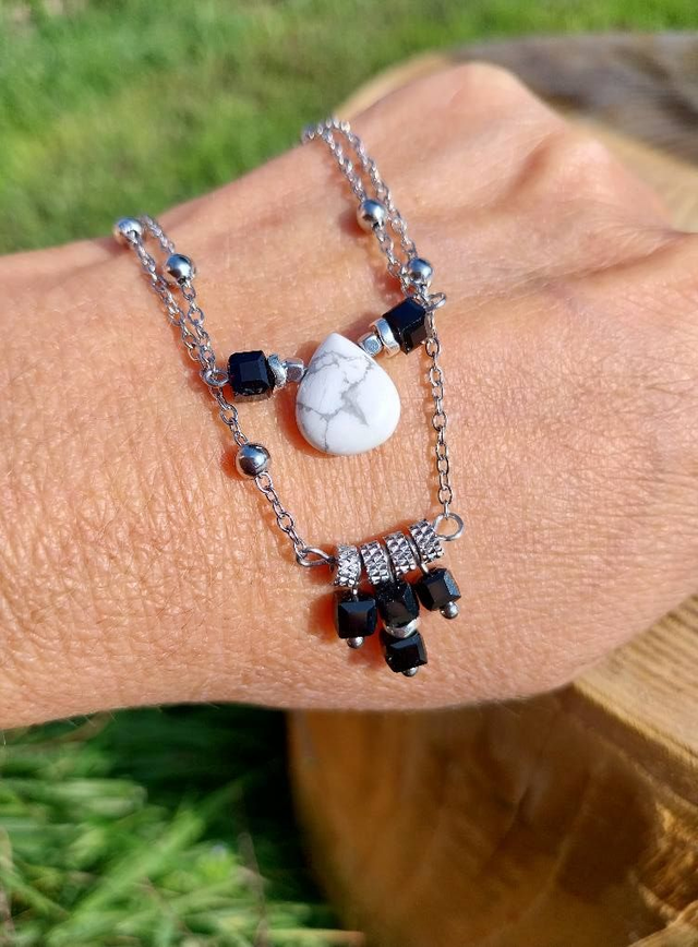 ✨ Collier 2 en 1 argenté goutte howlite et perles noires ✨️