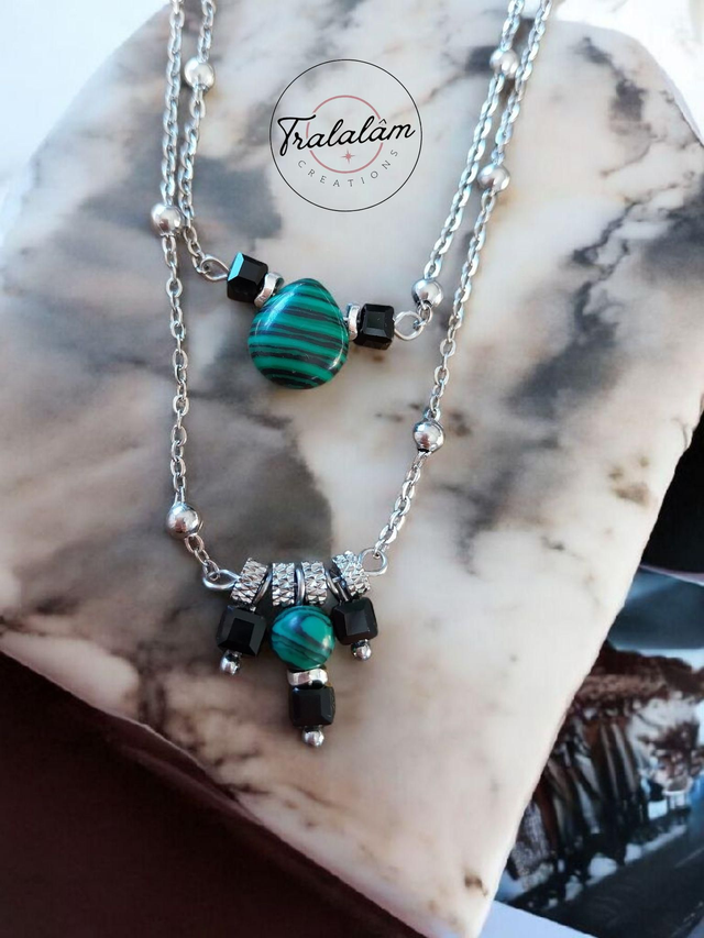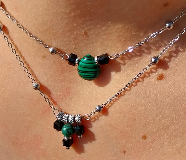 ✨ Collier 2 en 1 argenté goutte malachite et perles de verre noires ✨️