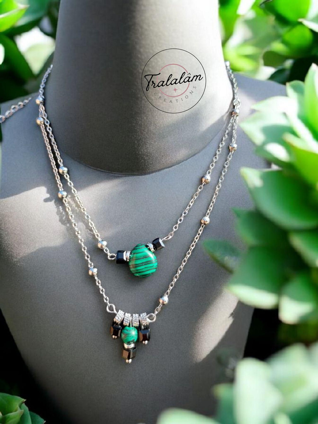 💚 Collier 2 en 1 argenté – Malachite & perles noires