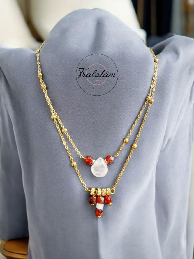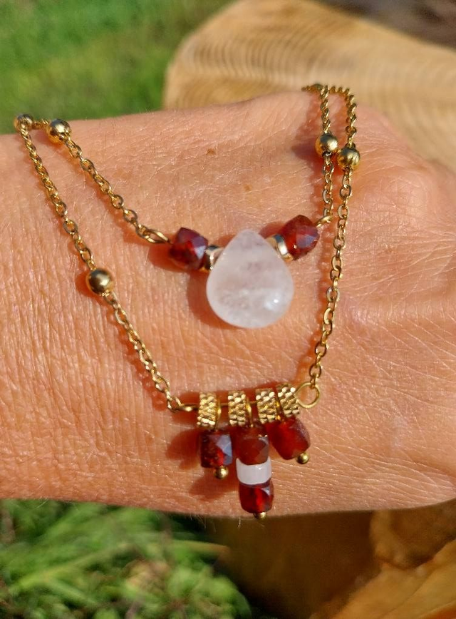 ✨ Collier 2 en 1 doré goutte quartz rose et perles grenat ✨