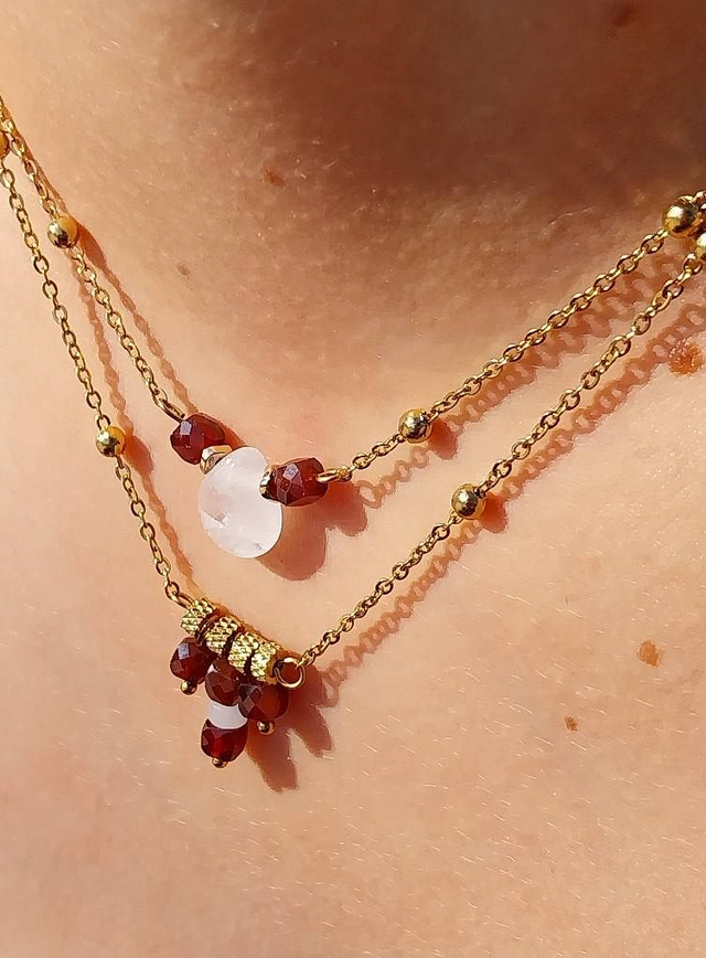 Le premier rang met en valeur une délicate goutte de quartz rose, symbole d’amour et de tendresse, entourée de perles facettées grenat aux reflets profonds et chaleureux.