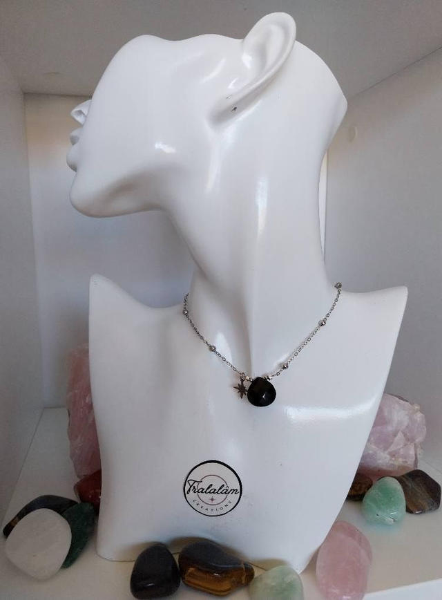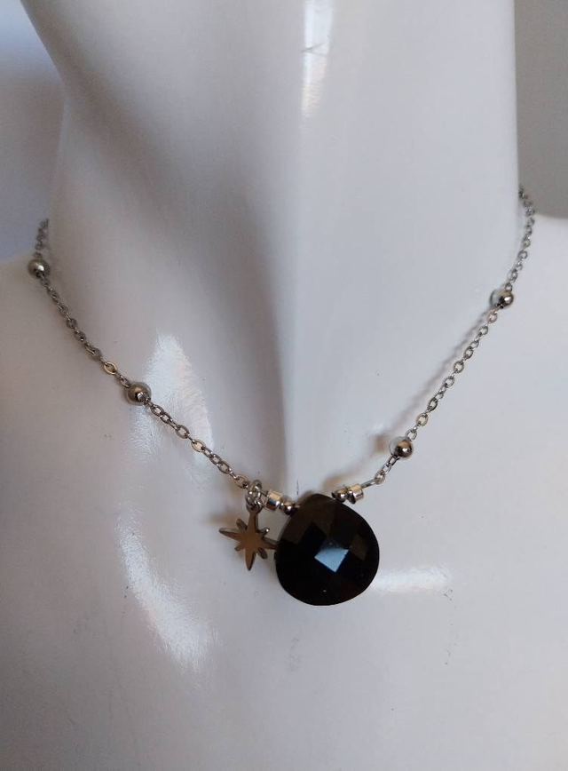 Finesse et éclat réunis dans un bijou raffiné. Sa chaîne argentée, ponctuée de petites perles lumineuses, met en valeur une pierre naturelle agate noire facettée, d’un noir profond. Une petite étoile polaire complète ce bijou avec une touche céleste.